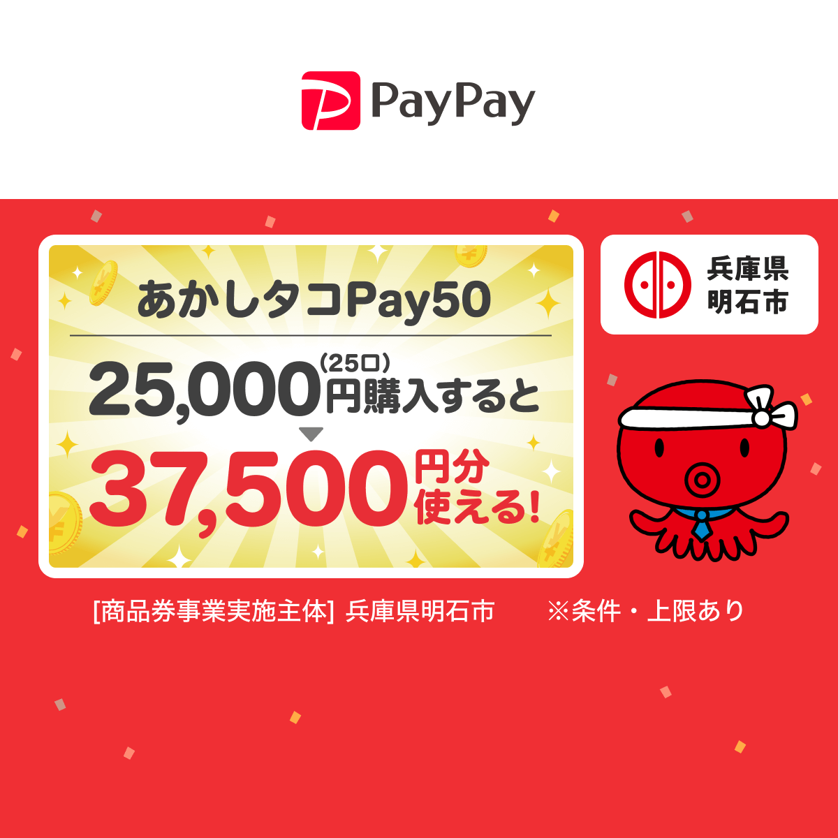 更に詳細情報を知りたい方はPayPay公式ページ「あかしタコPay50」をご確認くださいませ(下記)