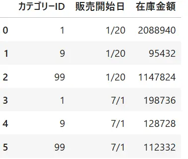 df2=df1.pivot_table(index="カテゴリーID", columns="販売開始日", values="在庫金額", aggfunc = 'sum')